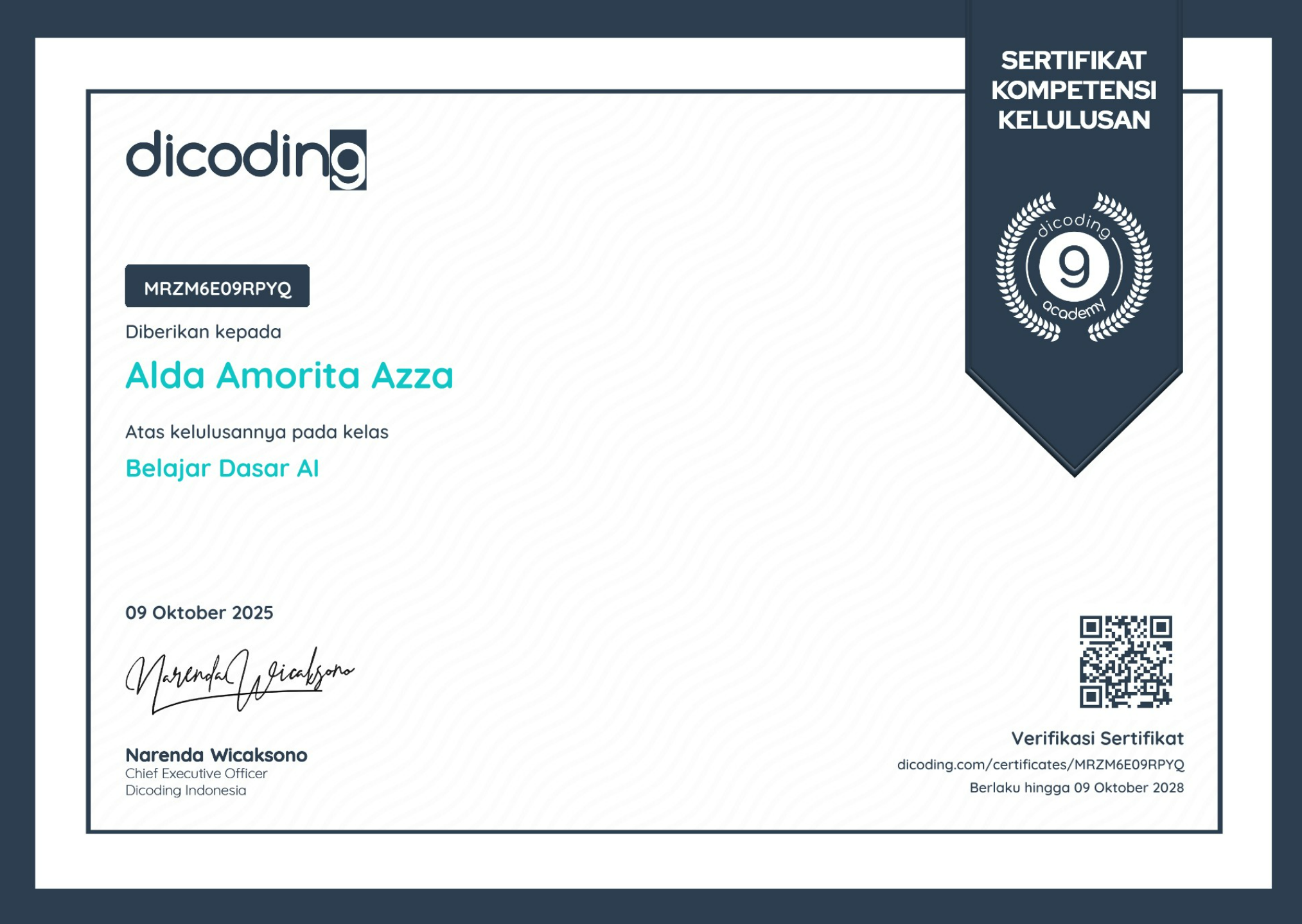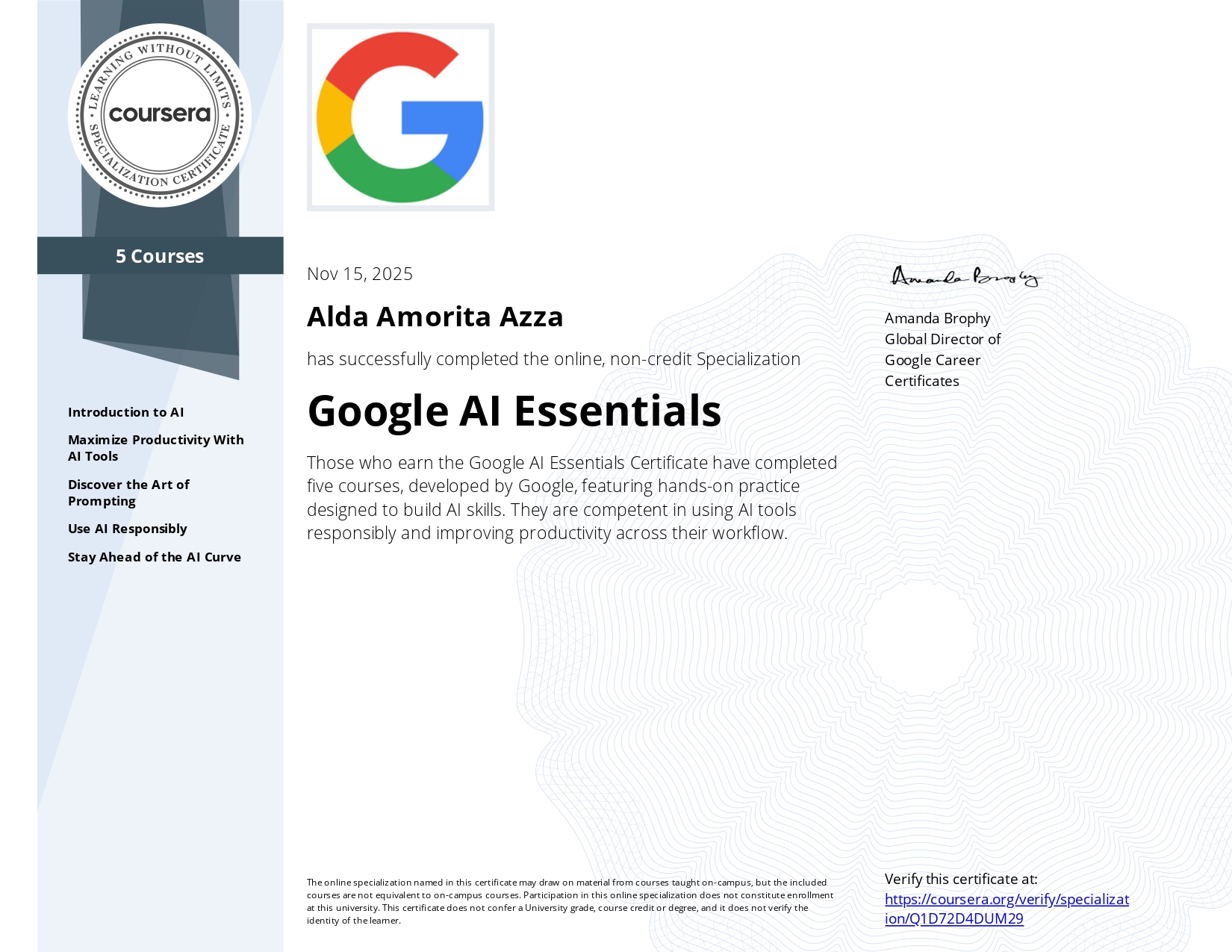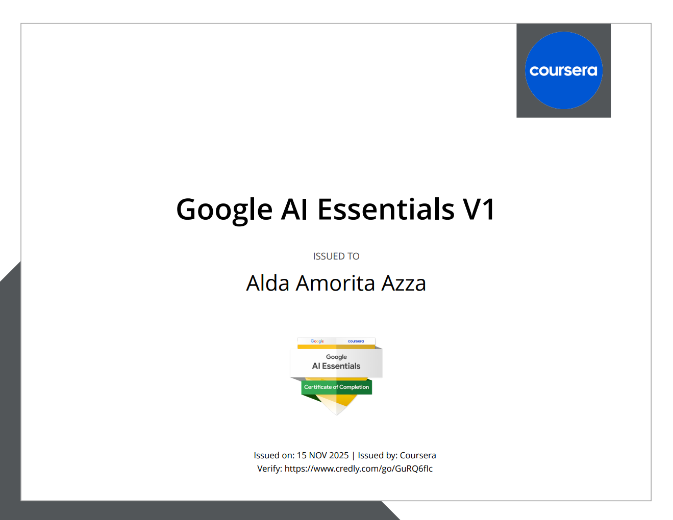 Hello!My name's Alda Amorita Azza, a Computer Science graduate who’s endlessly curious about how tech shapes everyday life. I’ve explored building web apps end-to-end, from designing the interface, crafting the backend logic, managing databases, integrating APIs, to making sure everything runs smoothly through testing. Along the way, I also discovered how much I enjoy collaborating with people and growing through teamwork on different projects. It turns out that sharing knowledge can be just as worthwhile as learning it myself. At the moment, I’m embracing every chance to learn, experiment, and sharpen my skills. With a big enthusiasm for continuous learning and adaptability, I aim to grow into a tech professional who’s skilled, creative, and ready to thrive in this ever-evolving digital world.